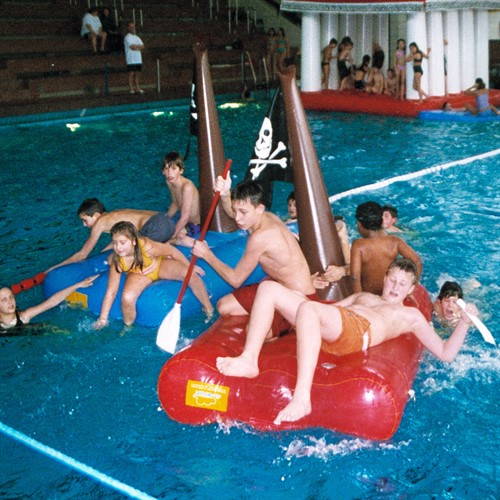 Den som ser den svarta flaggan med skallen vet omedelbart: det här är de ökända simbassängpiraterna på ett nytt uppdrag/tåg. Sjörövarflotten är byggd i en hast och redo att sätta segel med de små rövarna ombord.