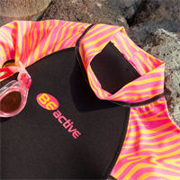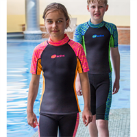 Våtdräkt Zebra för barn i blått och grönt med zebramönster i Shorty- modell, Zebra är tvådelad och består av en