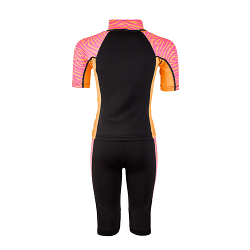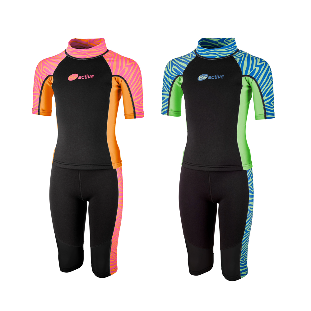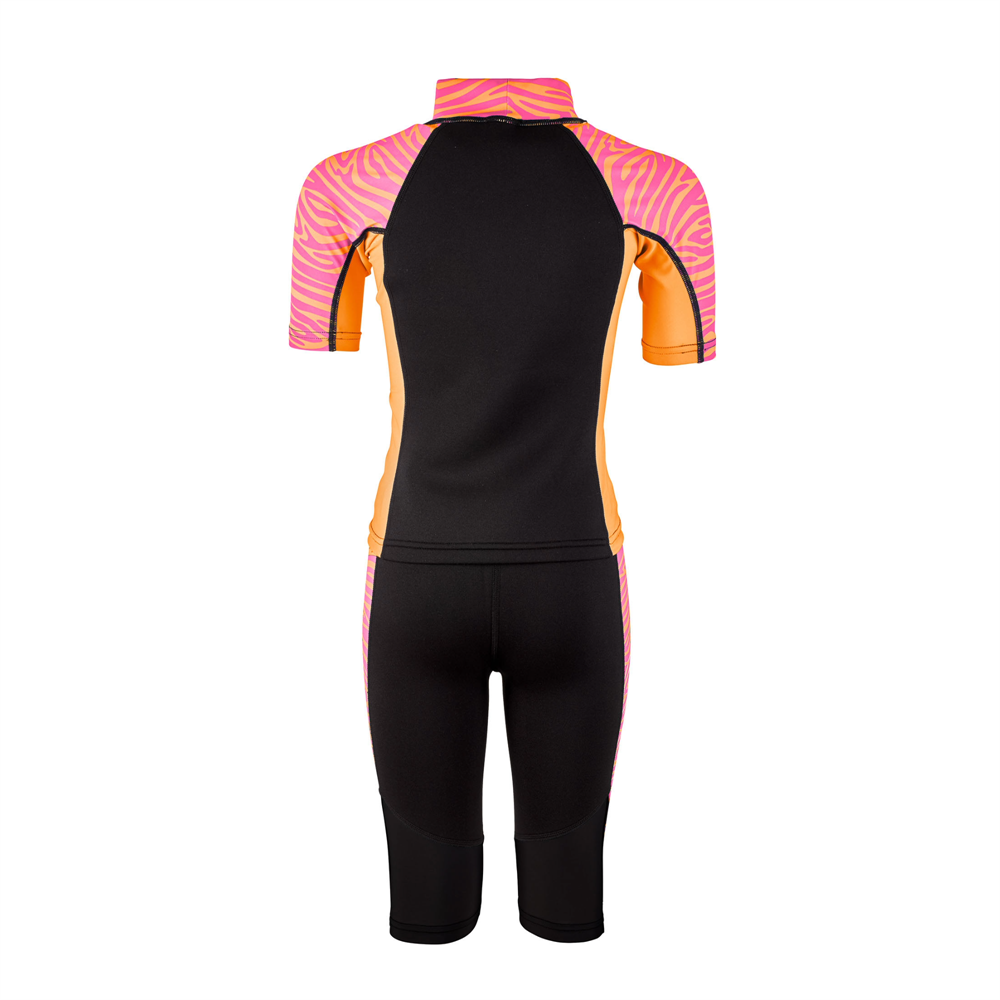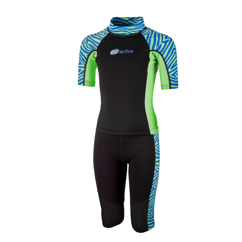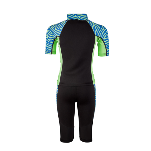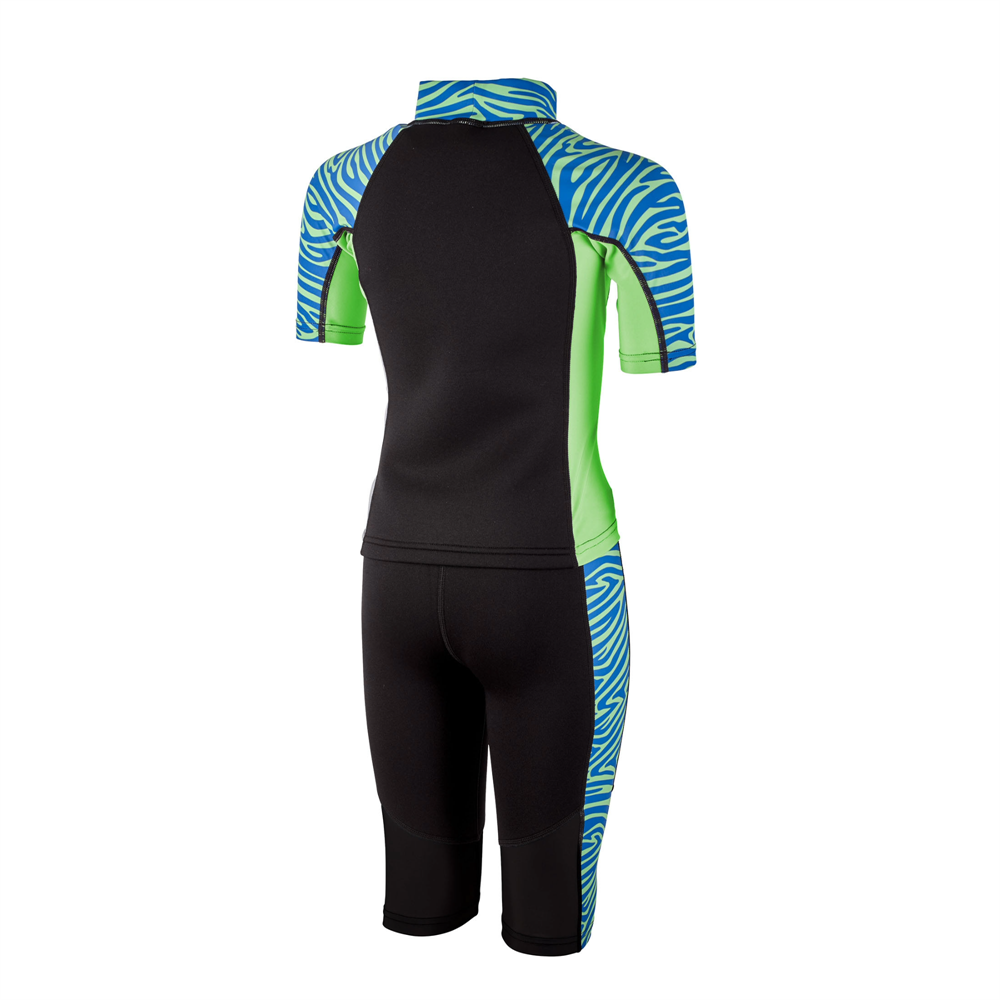 Våtdräkt Zebra för barn i blått och grönt med zebramönster i Shorty- modell, Zebra är tvådelad och består av en