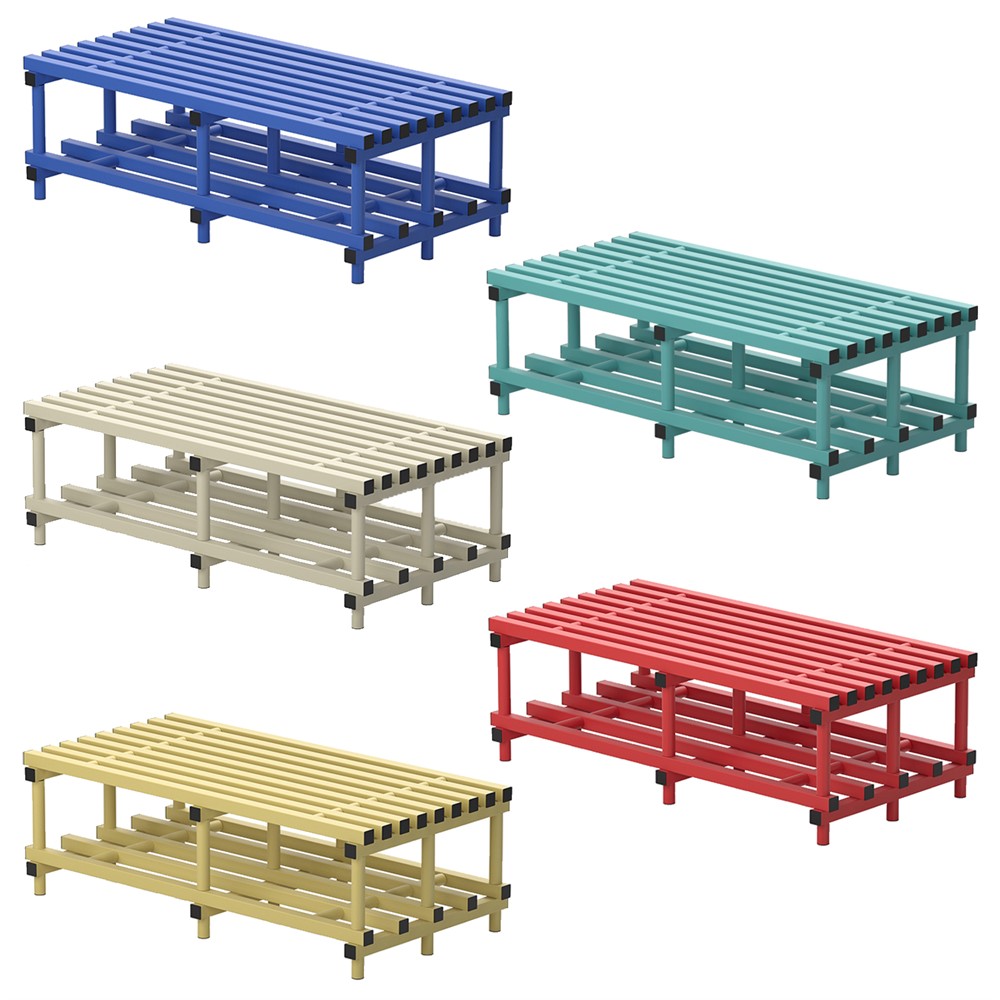 Bänk med bottenhylla. En multifunktionell och hygienisk produkt som är anpassat för tuffa miljöer både utomhus och inomhus. Bänken passar utmärkt att användas i simhallar, omklädningsrum, sportklubbar, skolor och lekplatser.