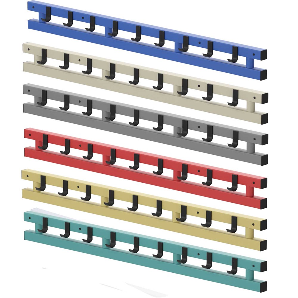 Vägghängare. Finns i tre längder med 6, 9 eller 12 krokar. Anpassat för tuffa miljöer både utomhus och inomhus. Vägghängare passar utmärkt att användas i simhallar, omklädningsrum, sportklubbar, skolor och lekplatser.