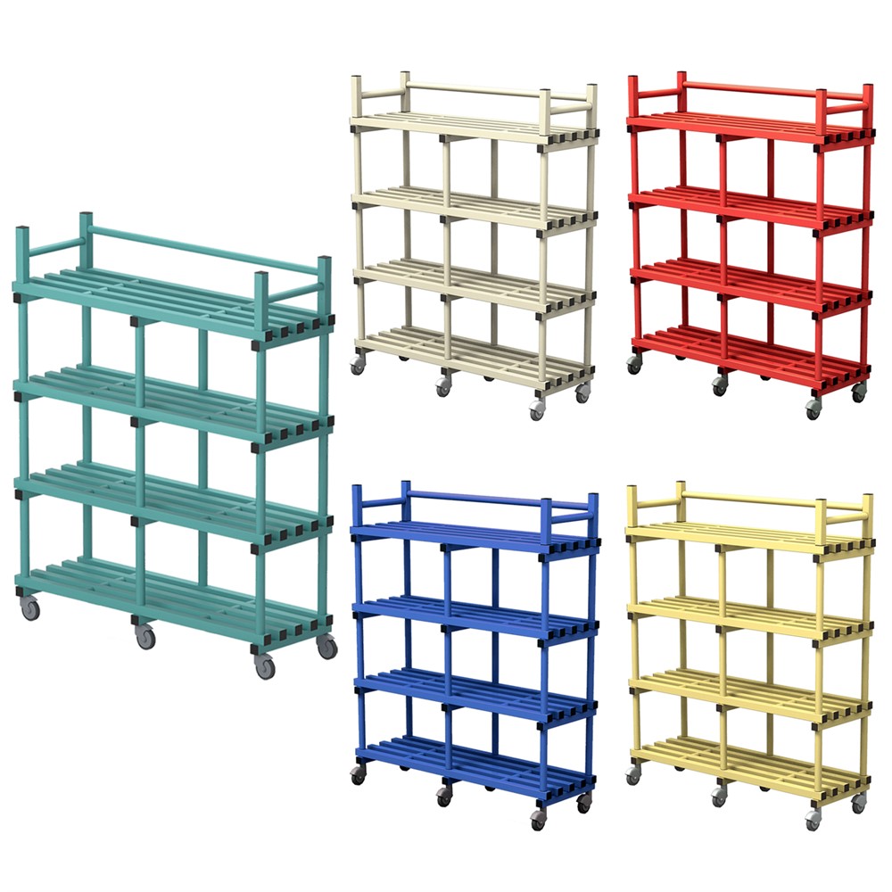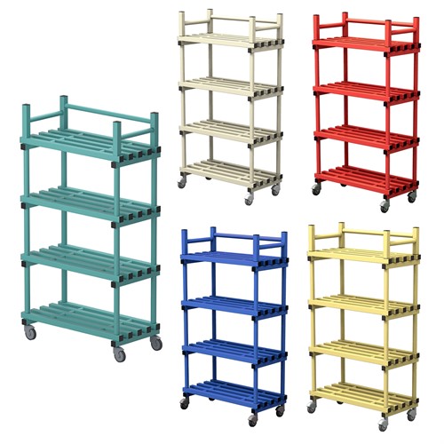 Mobil hylla med 4 hyllplan. Finns i två storlekar. Hylla utrustad med hjul varav 2 låsbara.