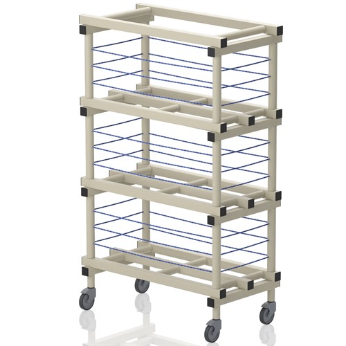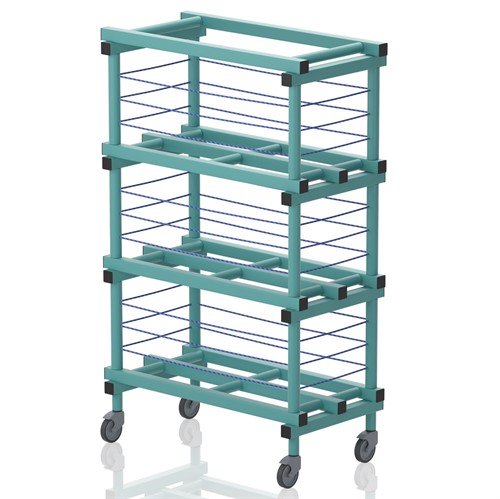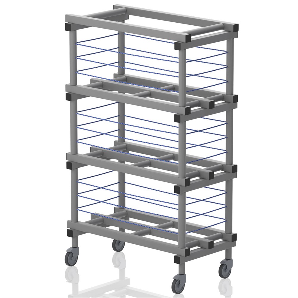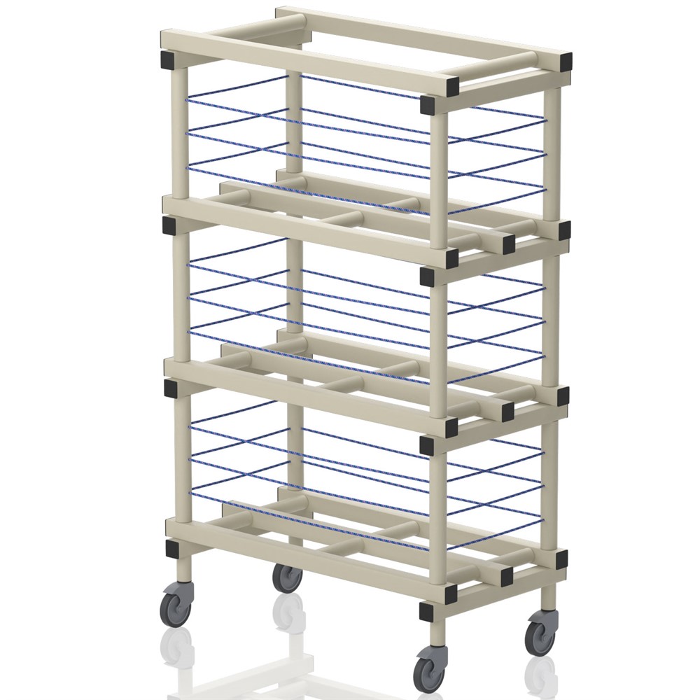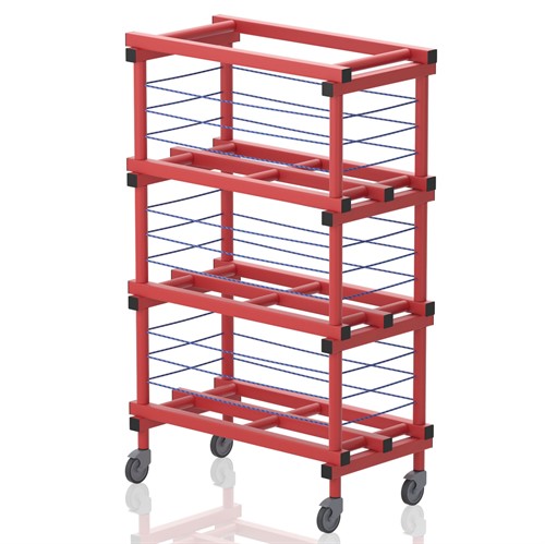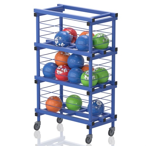 Bollhylla utrustad med hjul 2 varav låsbara. Bollar större än 20 cm hålls på plats med hjälp av gummilinor.