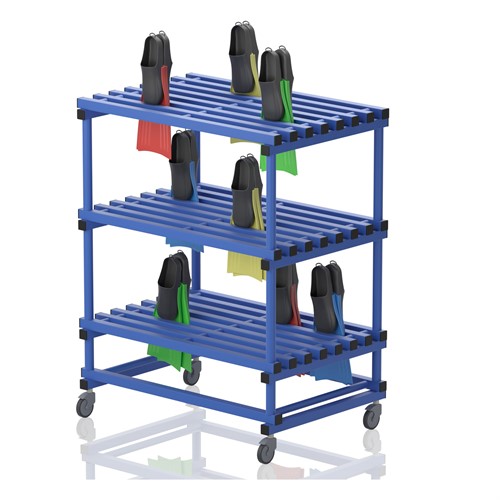 Hylla avsedd för simfenor. Utrustad med hjul varav 2 låsbara.