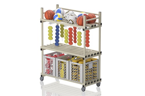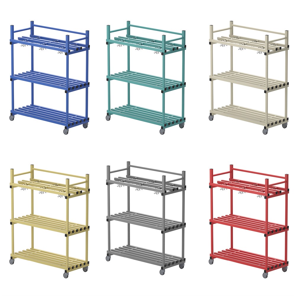 Tre hyllor varav en med krokar. Hylla utrustad med hjul varav 2 låsbara. Utmärkt till förvaring och transportering i simhall.