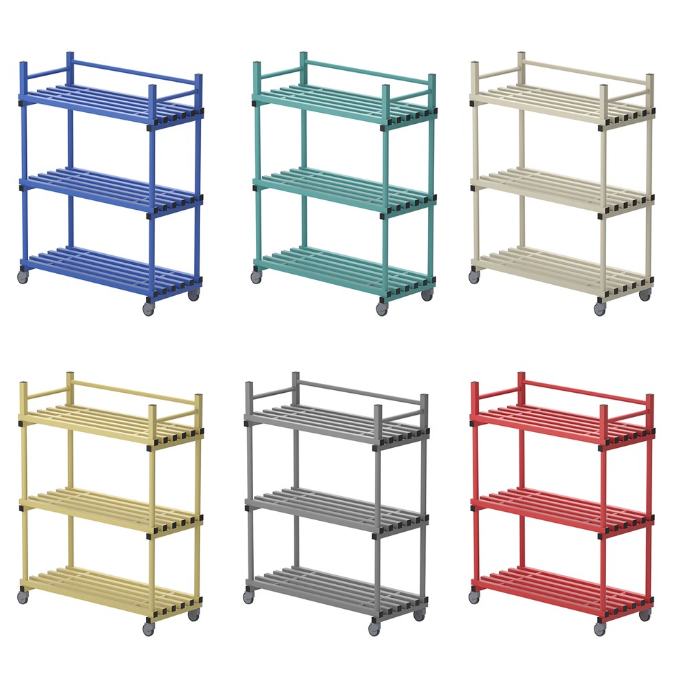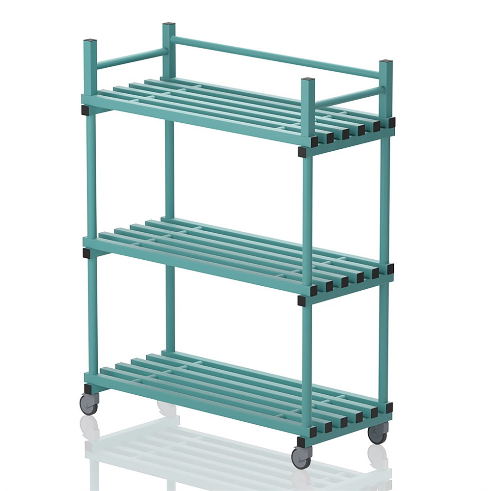 Utmärkt till förvaring och transportering i simhall. Hylla utrustad med hjul varav 2 låsbara.