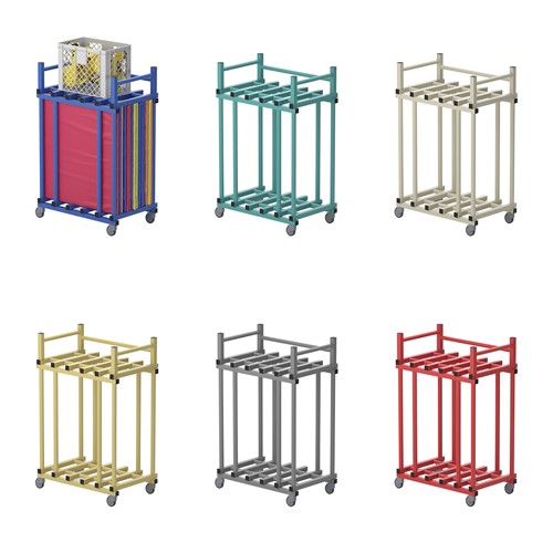 Bra förvaring till mattor. Hylla med kant för att ställa plastbackar.Utrustad med hjul varav 2 låsbara. Lätt,