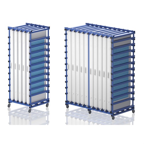 Vagn. Avsedd för 5 alt. 10 st mattor. Utrustad med hjul varav 2 låsbara. Lätt och hållbar vagn