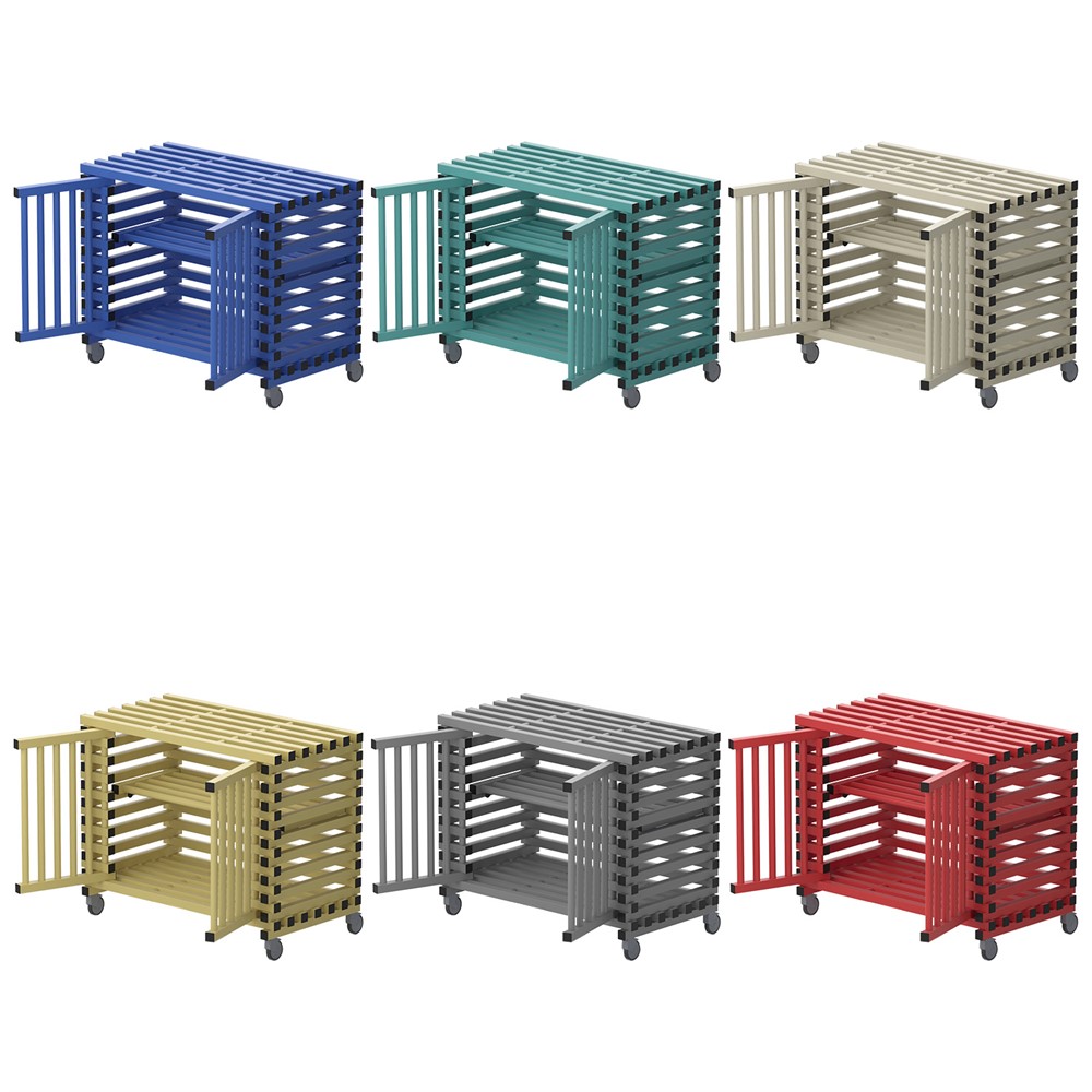 Förvaringsvagn med dörrar och justerbara hyllplan. Utrustad med hjul varav 2 låsbara. Idealisk för transport av utrustning i och runt poolområdet. Lätt och hållbar vagn som passar utmärkt att användas i simhallar, omklädningsrum, sportklubbar, skolor och lekplatser.