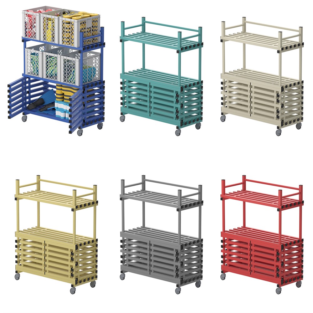 Hylla utrustad med hjul varav 2 låsbara, dörrar och tophylla.Utmärkt till förvaring och transportering i simhall.