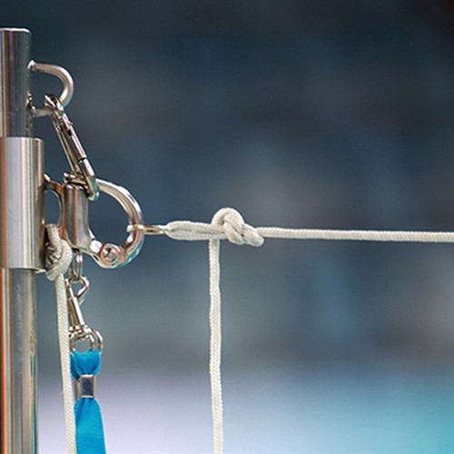 Slitstarkt polyetenrep, 5 mm diameter, använd som tjuvstartslina till tjuvstarts- och ryggsimsstång. Används även som avgränsningslina i bassänger.