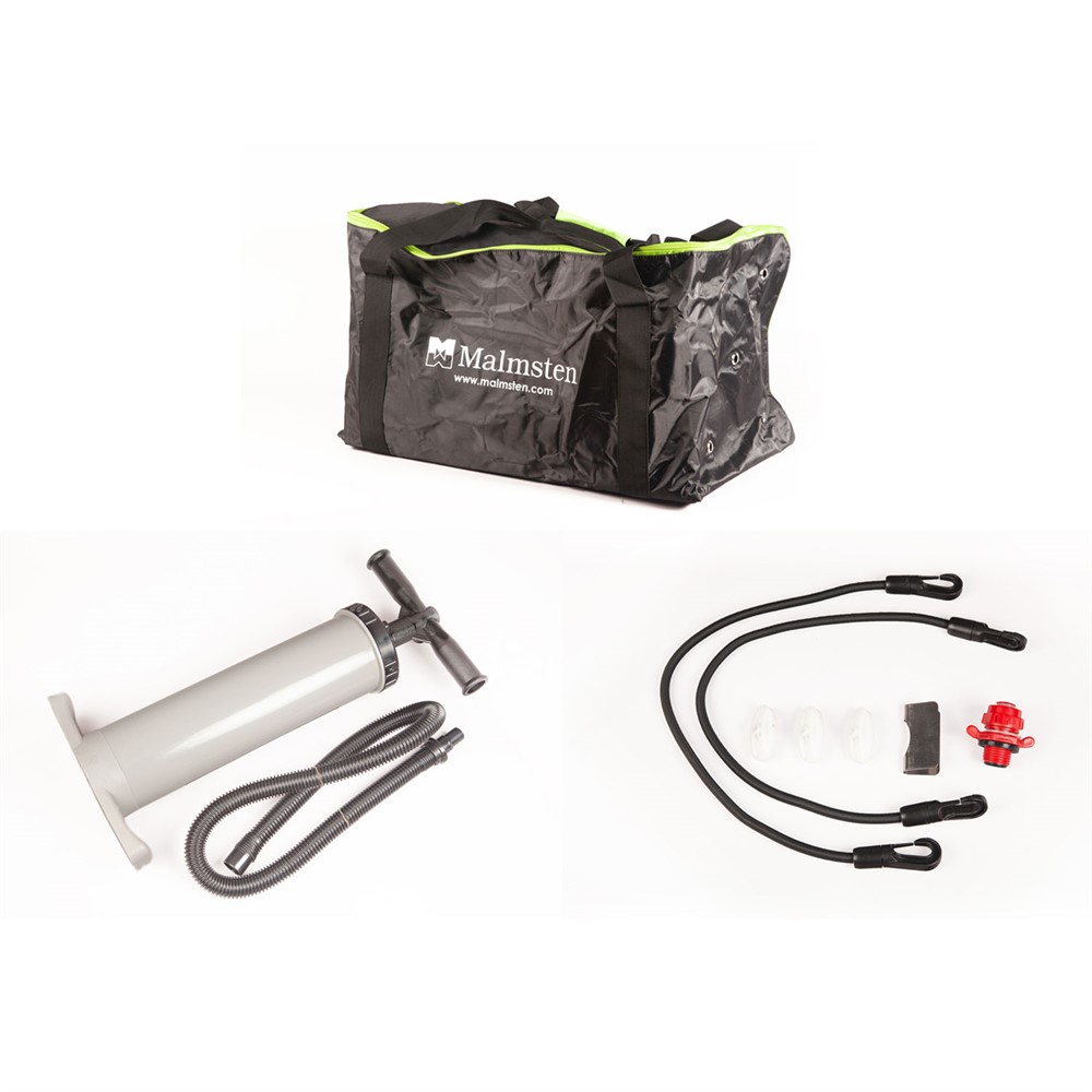 Förvaringsväska, handpump, reparationskit och extra ventil.