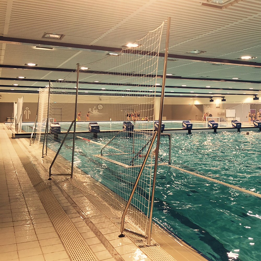 Kundanpassade lösningar för Stoppnät Vattenpolo kan variera beroende på poolens design. Till exempel kan man välja högre stolpar på 2,8 m med stödfot, vilket möjliggör att nätet hängs upp längs poolens kort- eller långsida med hjälp av en stålvajer och spännskruvar.