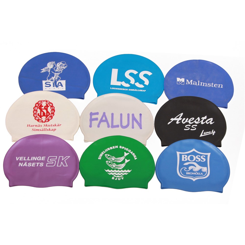 Silikonbadmössa, 1, 2, 3 eller 4-färgstryck. Viktigt att tänka på är att efter simpasset skölja av mössan i klorfritt vatten och hänga upp den så att den håller längre.
