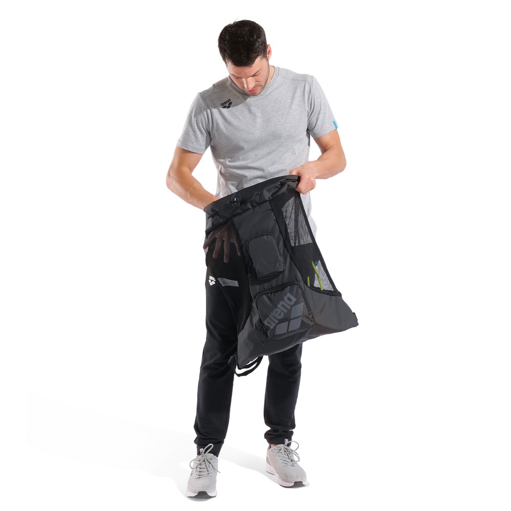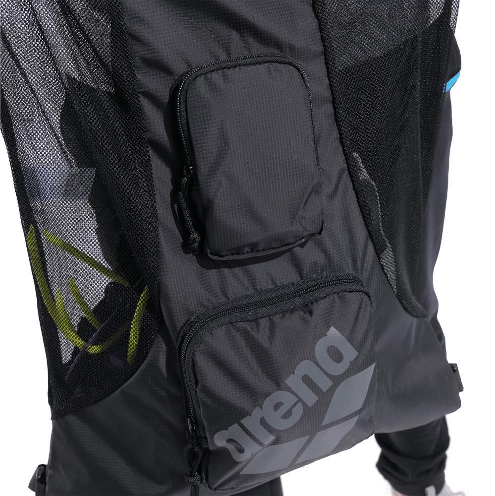 Den packbara och slitstarka All Set Pool Sack Mesh-väskan är perfekt för att bära träningsutrustning eller andra tillhörigheter. Den har smarta framfickor för att hålla småsaker torra. Den smarta nätkonstruktionen gör att vatten lätt kan rinna ut. Den kan bäras över ena axeln eller som ryggsäck. Utrustad med en praktisk ögla för att hänga upp den i omklädningsrummet eller på en annan väska, är den tillverkad av ett slitstarkt och snabbtorkande polyesternät. Mått: 65 cm x 50 cm x 1 cm, 40L