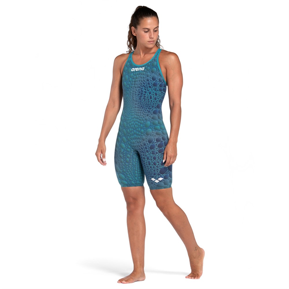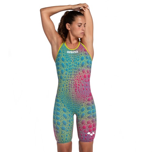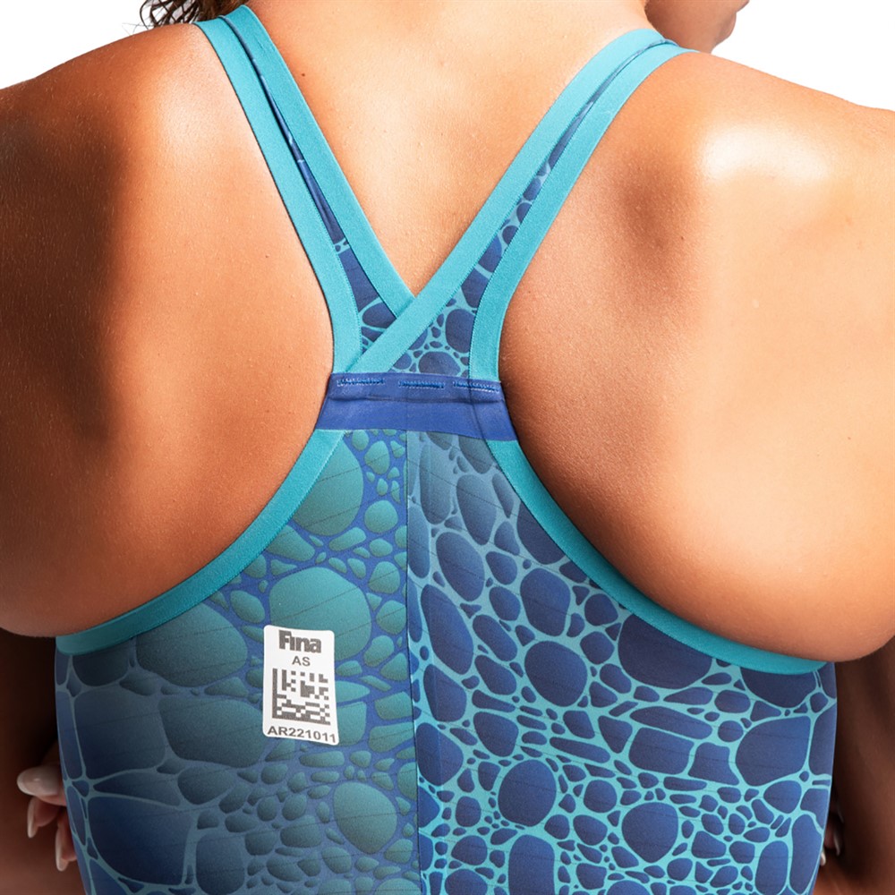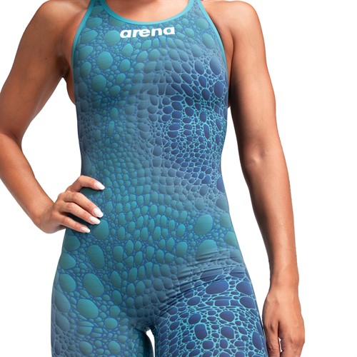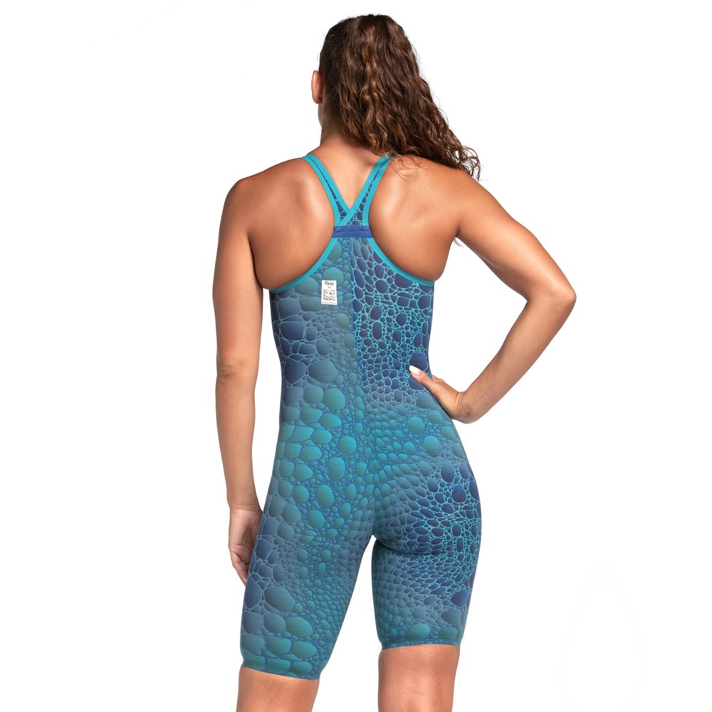 Limited Edition Caimano Closed Back Powerskin Carbon Air² tech-dräkt för kvinnor är inspirerad av färgerna och djurlivet i Karibien. Den är både vacker och snabb, med ett tryck av reptilskinn och avancerad textil med horisontella kolfiberband. Dräkten är skuren i ett enda tygstycke med en söm, absorberar mindre vatten och minimerar luftmotståndet. Den unika 3-panelshuden ger flexibilitet och bekväm kompression till denna lätta racingdräkt.
