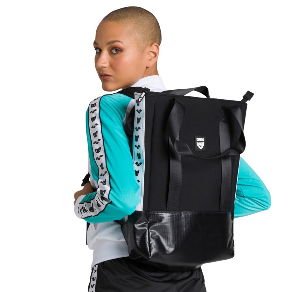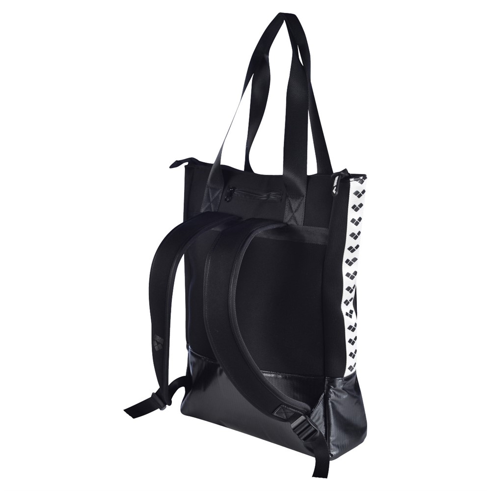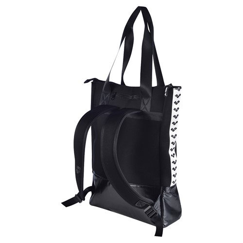 Växla enkelt från kontor till poolen eller gymmet med vår All Black Fast Tote. Den här eleganta väskan är tillverkad i ett slitstarkt svart tyg och kantad med våra svarta arena diamanter på sidorna. Det vadderade laptopfacket och den förstärkta basen ser till att dina tillhörigheter är skyddade. Bär den över axeln eller för hektiska dagar på ryggen som en ryggsäck. Ha små nödvändigheter som nycklar och telefoner nära till hands i ytterfickan med dragkedja. Den har ett generöst fack med dragkedja och separat laptopfack. Utrustad med två små fickor med dragkedjor och en badväska inuti.